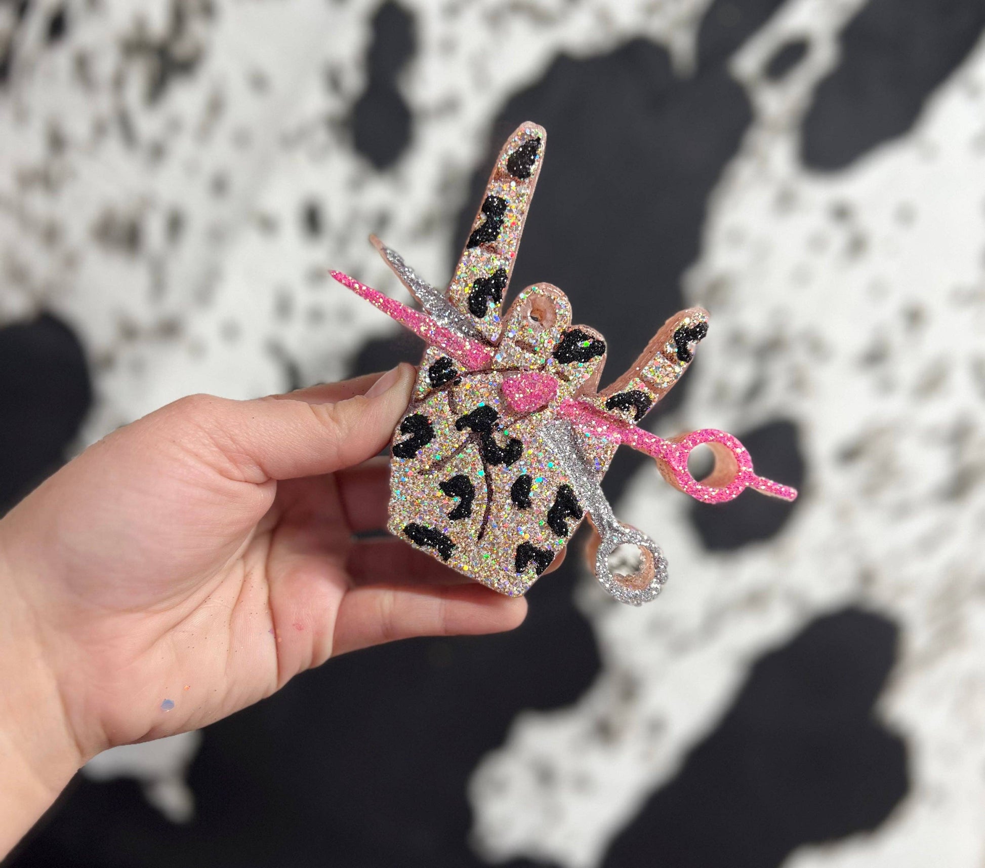 We offer cow print, leopard print, and plain designed hair stylist freshners!