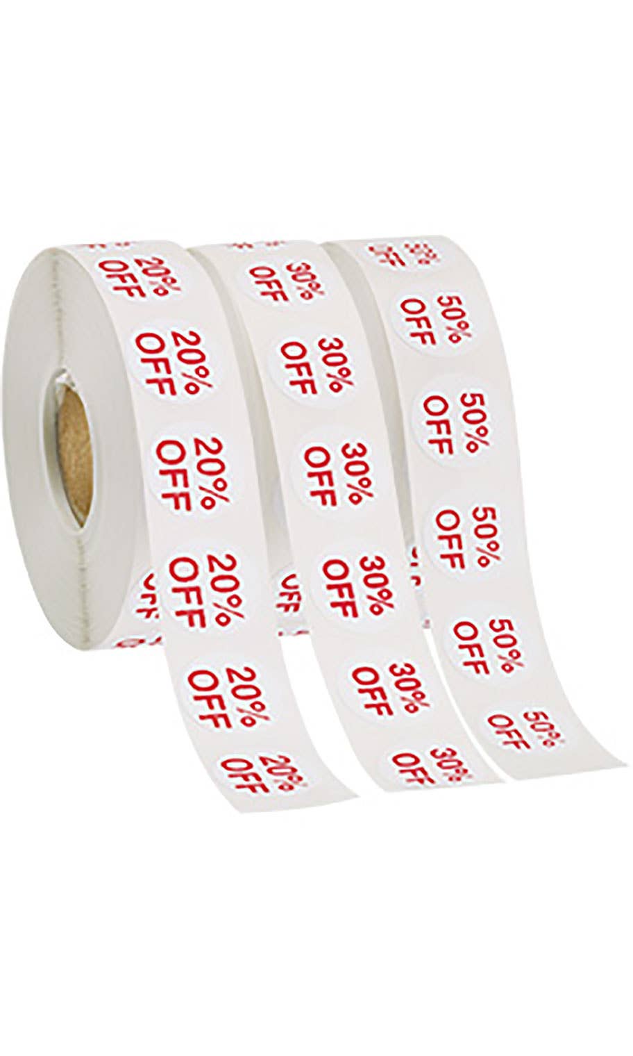 Our Discount Label Kit Self-Adhesive Labels are great for pricing merchandise for sale promotions. Each kit features one of each: 20%, 30% and 50% off. Each label features a smooth 3/4" diameter white matte finish with red print. 1,000 labels per roll.