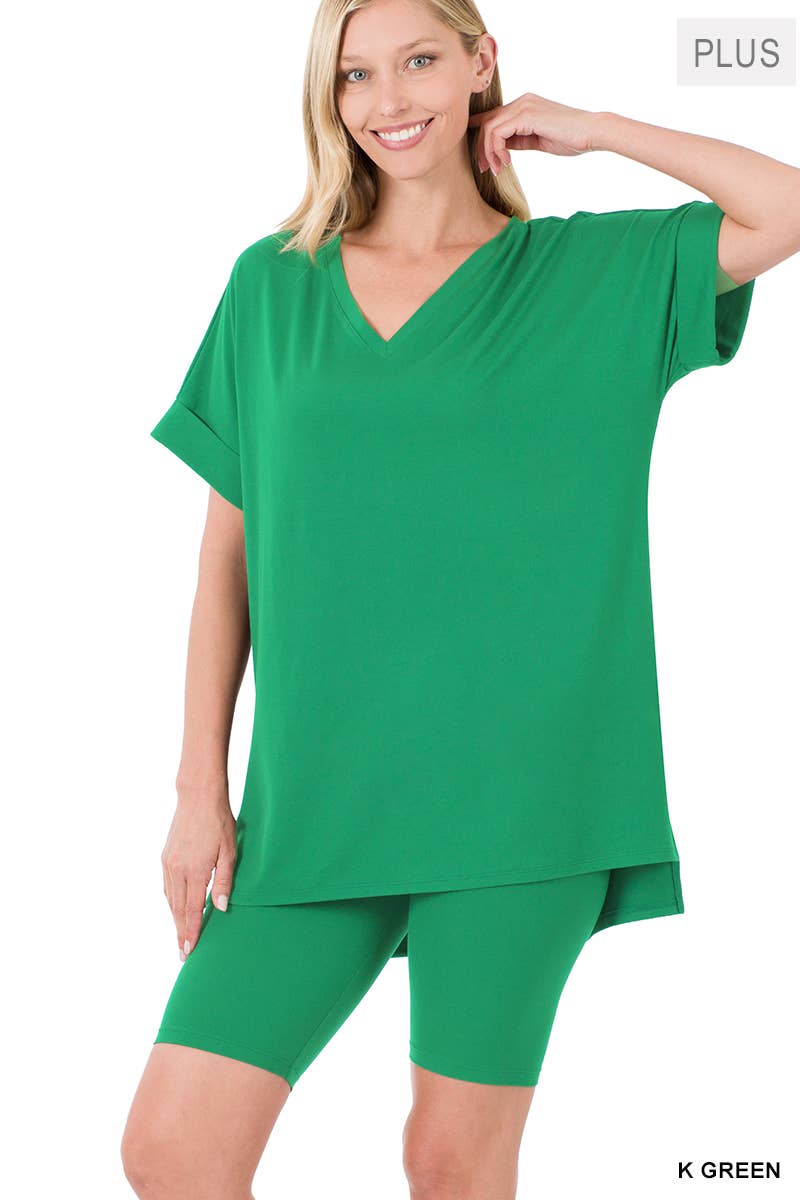 Plus V Ncek Hi Low Hem Top & Biker Shorts Set- V-NECK HI-LOW HEM TOP