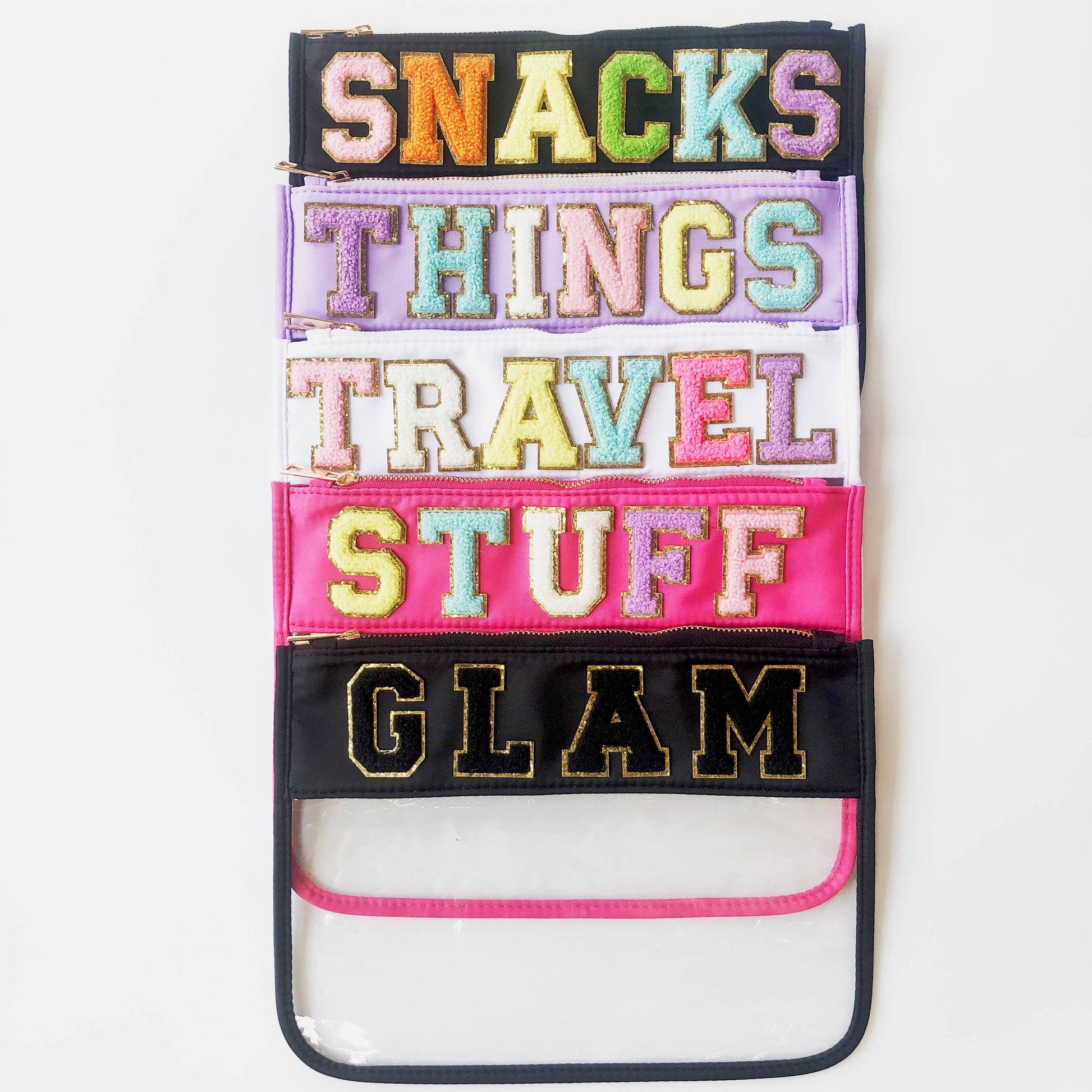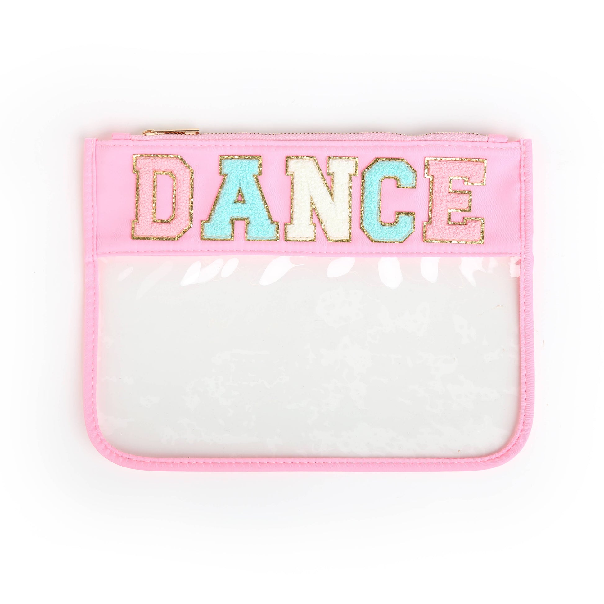 This clear pouch with colorful top and trim features a gold zipper and chenille varsity letters patches with gold trim. Our patches are SEWN on - not stickers.